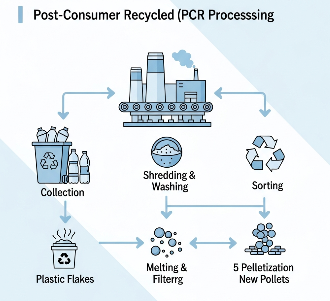 Definitie: Materialul PCR este derivat exclusiv din produse care au fost utilizate de consumatorii finali, colectate prin programe de reciclare stabilite și deturnate din gropile de gunoi sau oceane. Acestea includ articole de zi cu zi, cum ar fi sticle de apă din plastic uzate, recipiente pentru iaurt, ulcioare de detergent și cutii de aluminiu.